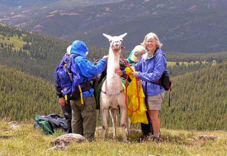 It depends on many factors, but in general, 65 to 80 pounds is common. Strong, well conditioned, packers can carry loads of 100 pounds. However, I don’t recommend people plan on this till they have lots of trail experience and know what the animals are capable of. If you are trying to carry too much weight, a llama will get tired and lay down on you. At that point you are stuck till they can go again. If this happens you need to take some weight off the tired packer and get another to carry it. If you have packed all llamas with maximum loads, you don’t have any flexibility and may have to camp for the night in a spot that is not good for pitching tents or with no water or grass for the llamas.